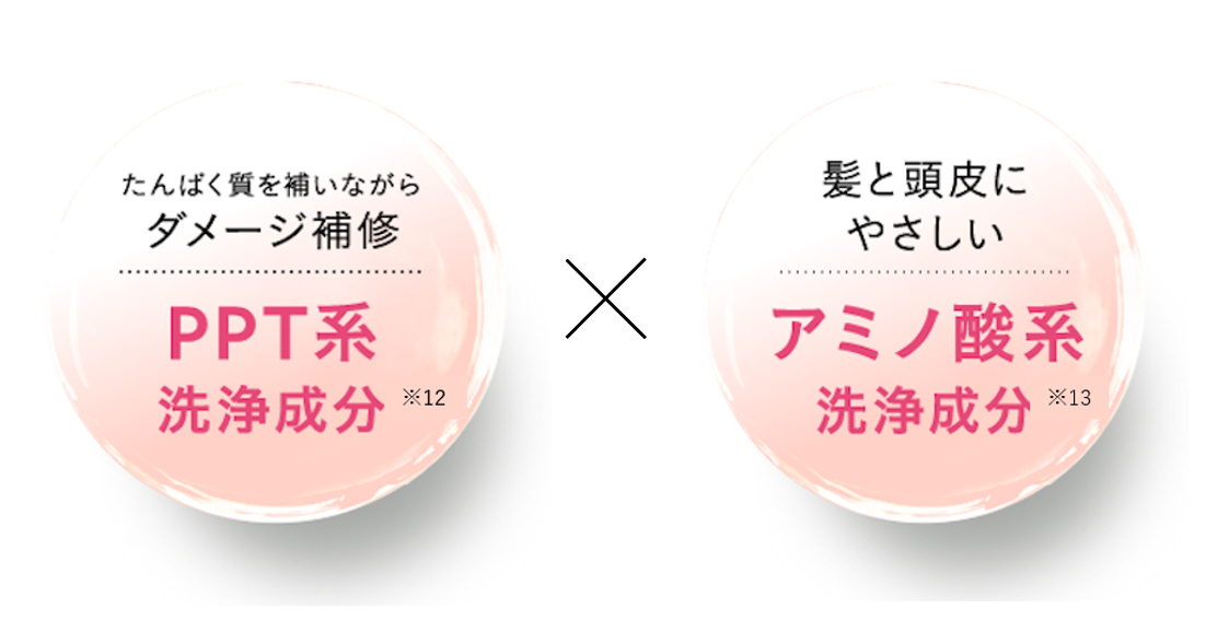 ダメージ補修をしながら洗い上げるPPT系洗浄成分※12と髪と頭皮をやさしく洗い上げるアミノ酸系洗浄成分※13をW採用。髪と頭皮をいたわりながら、毛髪ダメージにアプローチします。