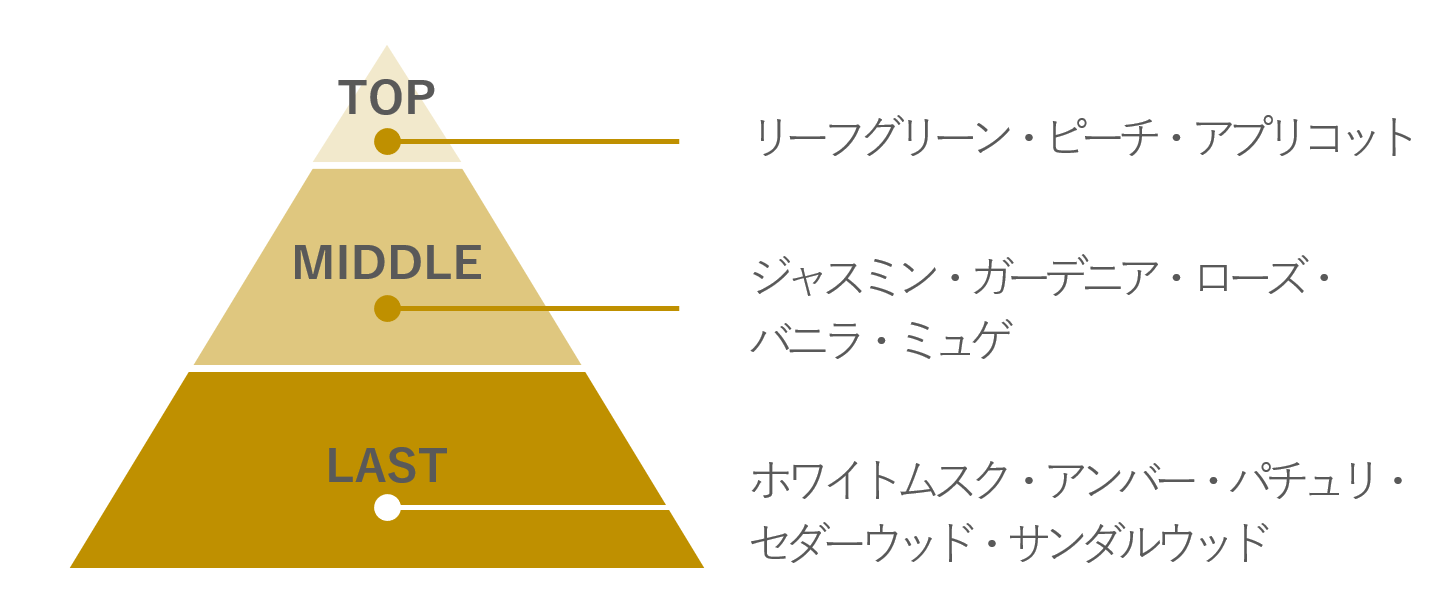 ジャスミンをベースとした上品なフローラルノートに、アプリコットとピーチの程よい甘さをプラスした華やかな香り。香水のような高級感で、上品かつ深みのある印象に仕上げました。
