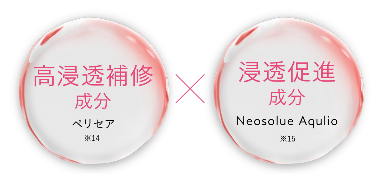 高浸透補修成分※14と浸透ケア成分※15を掛け合わせることで美容成分を髪内部にすばやく届けながら、毛髪補修成分とキューティクルケア成分*が髪の内部・外部からダメージを補修します。