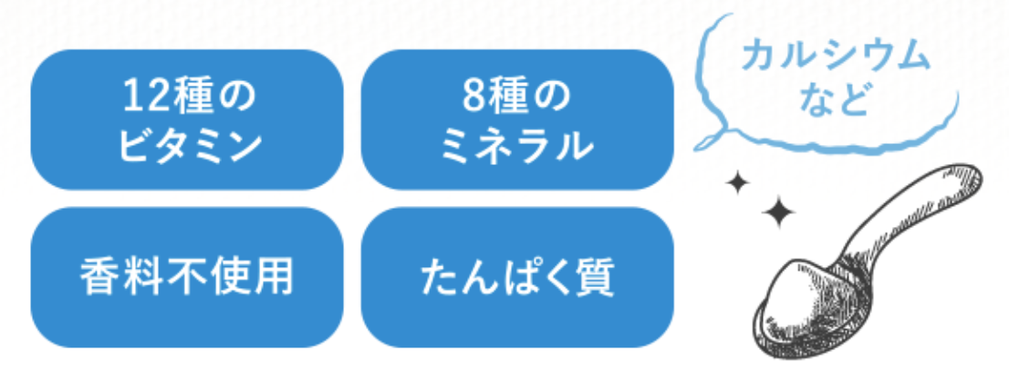 たんぱく質、カルシウムなど8種のミネラル、12種のビタミンなど、多くの栄養素が毎日の健康をサポートします。そのまま溶かして飲んでいただくほか、粉末なので、コーヒー、おみそ汁やシチューなどに混ぜたり溶かしたり、いろいろなものに使えます。やさしいミルク味で飽きのこない美味しさです。