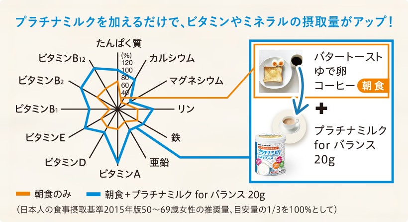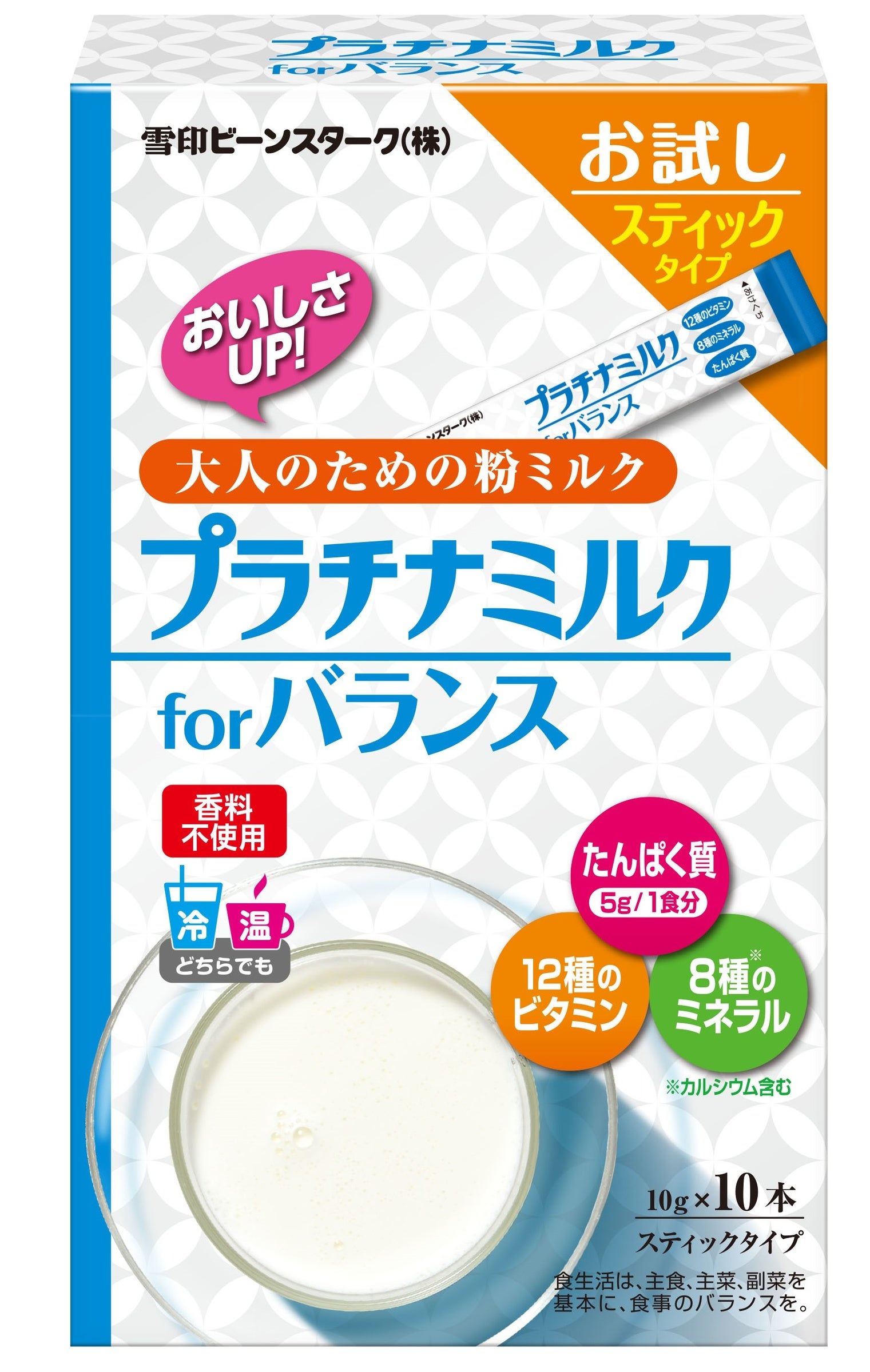 母乳や粉ミルクの研究を活かして開発された「プラチナミルク for バランス」は、たんぱく質、カルシウムなど8種のミネラルや12種のビタミンを含む栄養バランスサポート食品です。お湯やお水で溶かしてそのままお召し上がりいただくだけでなく、いつものメニューに「ちょい足し」していただくだけで、おいしくて栄養満点なお食事をお楽しみいただけます。普段使いからまたアクティブに運動する方にもおすすめです。この機会に是非おためしください。