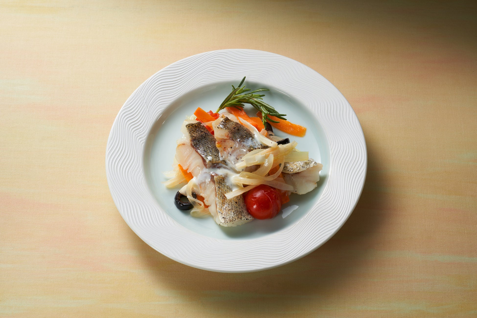 ②22㎝×22㎝のクッキングシート2枚を用意し、1枚の中央ににんじん、玉ねぎ、セロリの1/2量を置き、上にタラ2切れをのせ、塩、こしょうを振る。ミニトマト、黒オリーブ、ローズマリーの1/2量をのせ、オリーブオイル大さじ1/2をかける。もう1枚も同様に。