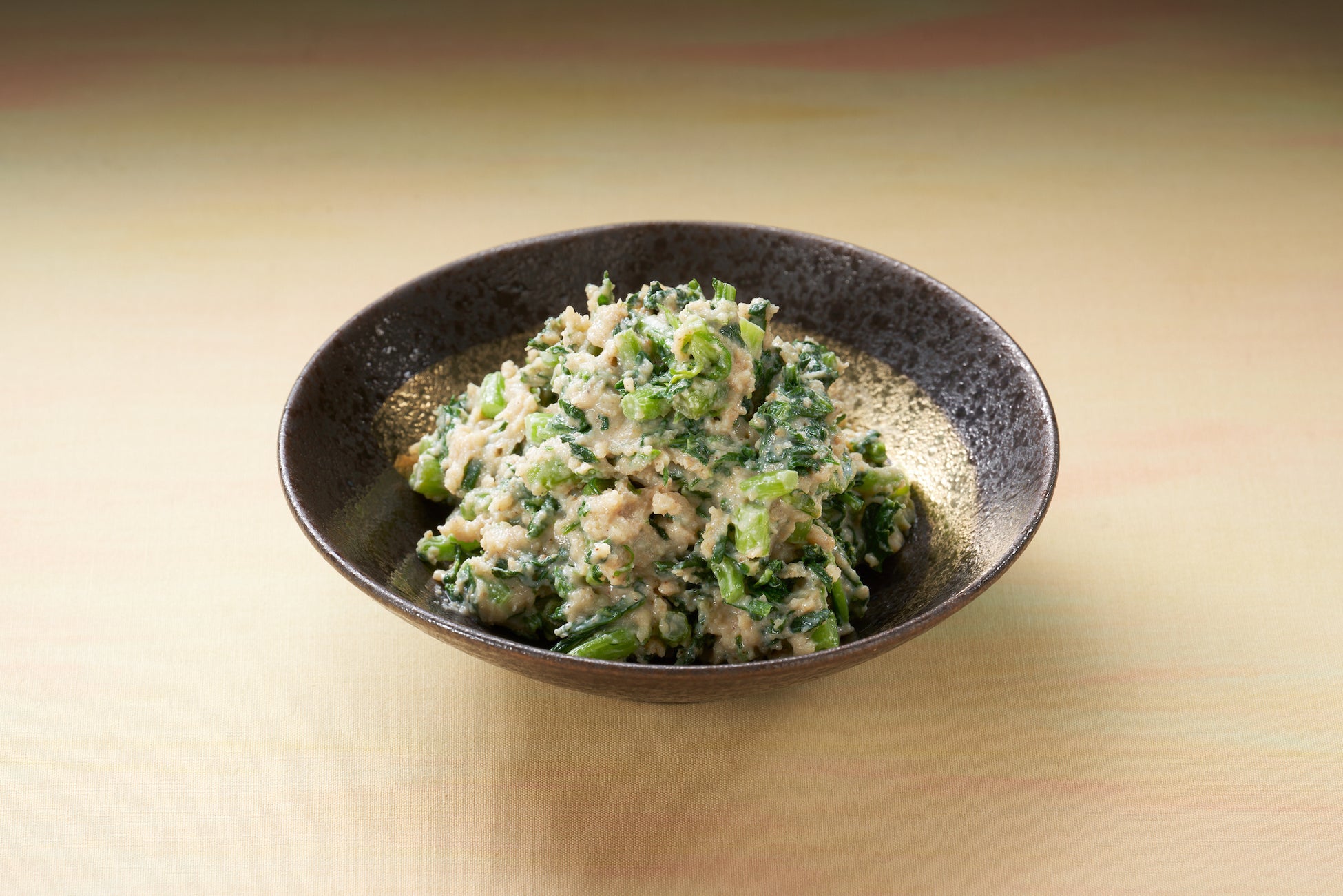 豆腐をペーパータオルで包み、耐熱皿にのせ、電子レンジ600Wで1分加熱。ボウルに移し、{A}を加えて混ぜる。②春菊はゆでて水に取って絞り、1~1.5㎝幅に切る。しょうゆをかけ、もう一度キュッと絞る。