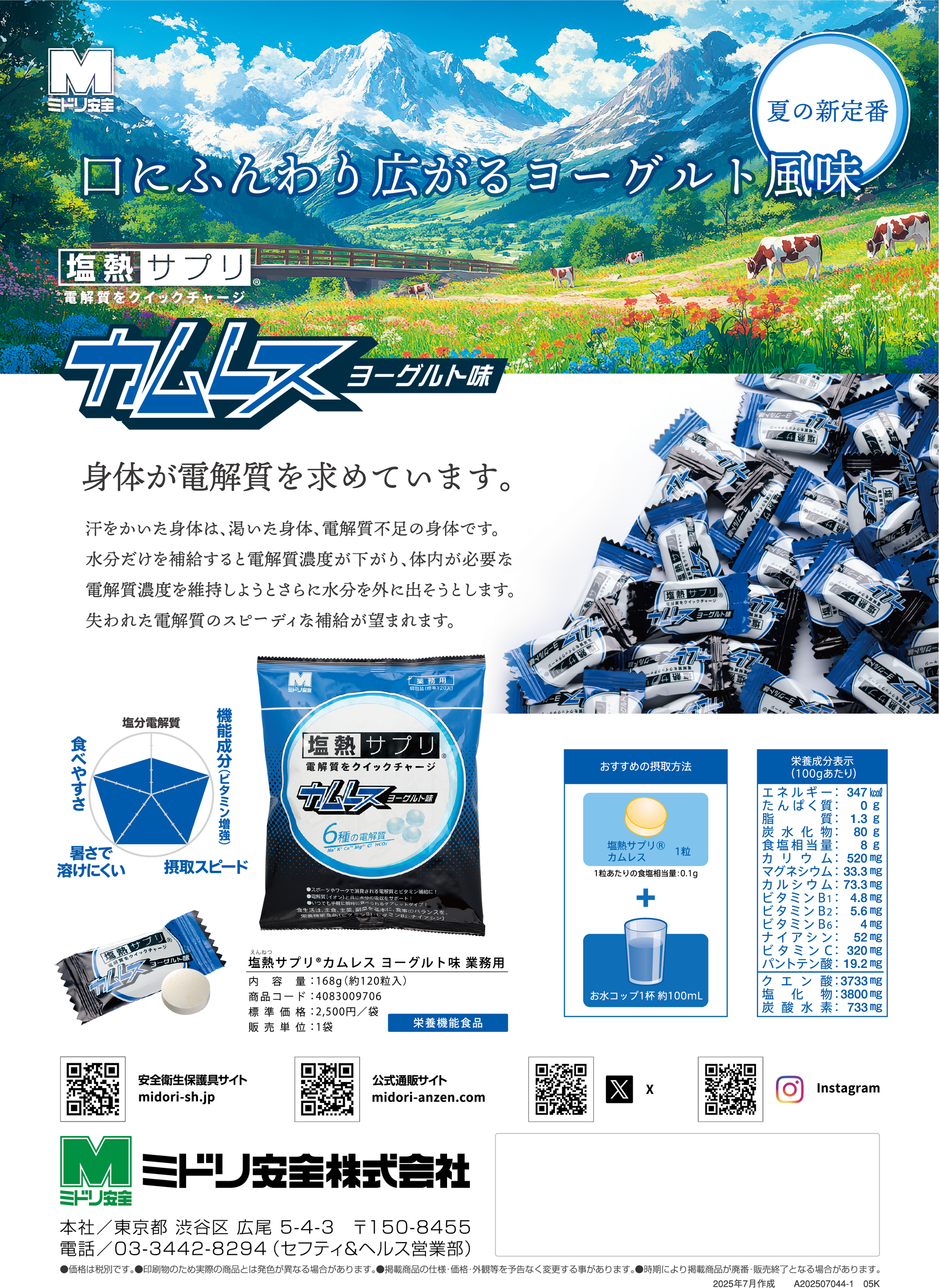 安全靴や作業着等を販売するミドリ安全株式会社(本社:東京都渋谷区、代表取締役社長:松村 乾作)は、ロングセラー塩熱飴シリーズの新商品として、かむ力が弱い方でも摂取しやすく、口の中で素早く溶ける熱中対策サプリメント「塩熱サプリ®カムレス ヨーグルト味」を、2025年8月より販売開始いたしました。