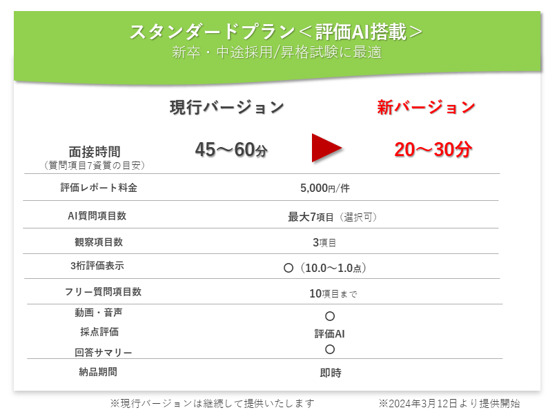 このたび、従来のスタンダードプランに加え、ヒアリングを行うAIアルゴリズムを変更し、面接評価レポートのクオリティは維持したまま、面接時間を約半分(20分〜30分程度)に短縮した新バージョンを追加提供いたします。