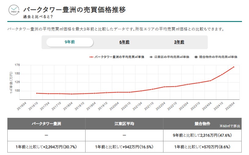 1.マンションナビのデータをもとに、9年前(2016年)の価格推移と比較