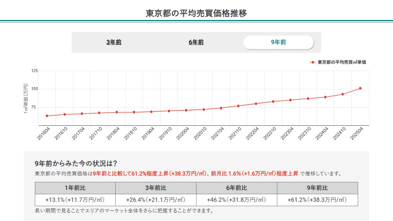 2025年4月時点での東京都全体のマンション平均売買㎡単価は101万円で、9年前と比べて61.2%上昇しています。