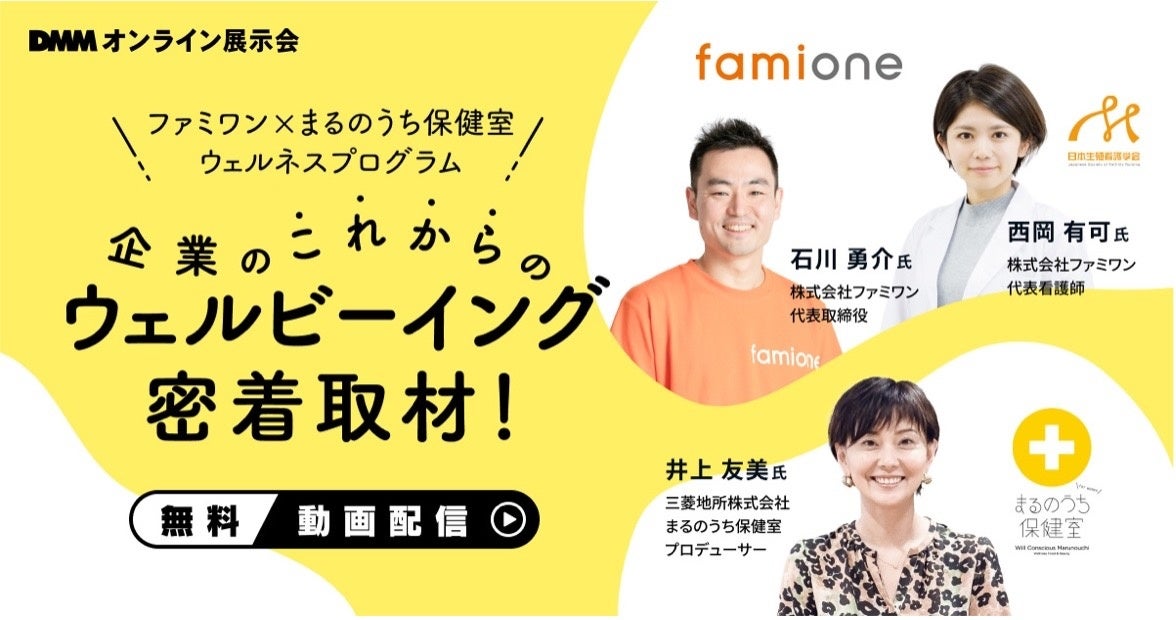 「子どもを願うすべての人によりそい 幸せな人生を歩める社会をつくる」をビジョンに掲げ、LINEを活用した妊活コンシェルジュサービス「famione(ファミワン)」 https://lp.famione.com/ を提供する株式会社ファミワン(本社:東京都渋谷区、代表取締役:石川 勇介、以下当社)の代表取締役の石川と代表看護師の西岡が、DMMオンライン展示会の「フェムテック推進EXPO ONLINE」へアンバサダーとして登壇します。また、2021年9月から12月まで開催した三菱地所まるのうち保健室との協業によるウェルネスプログラムに関する対談動画など、特集動画「企業が実践するウェルビーイング最前線」にて出演協力を致しました。
