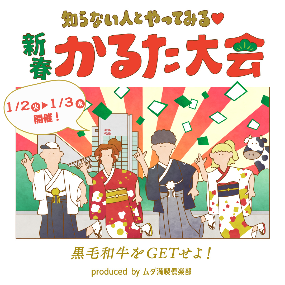 ルクア大阪オリジナル「かるた」をプレイしながら、新春にみんなで初笑いできるような仲間ができるかもしれないイベントです。