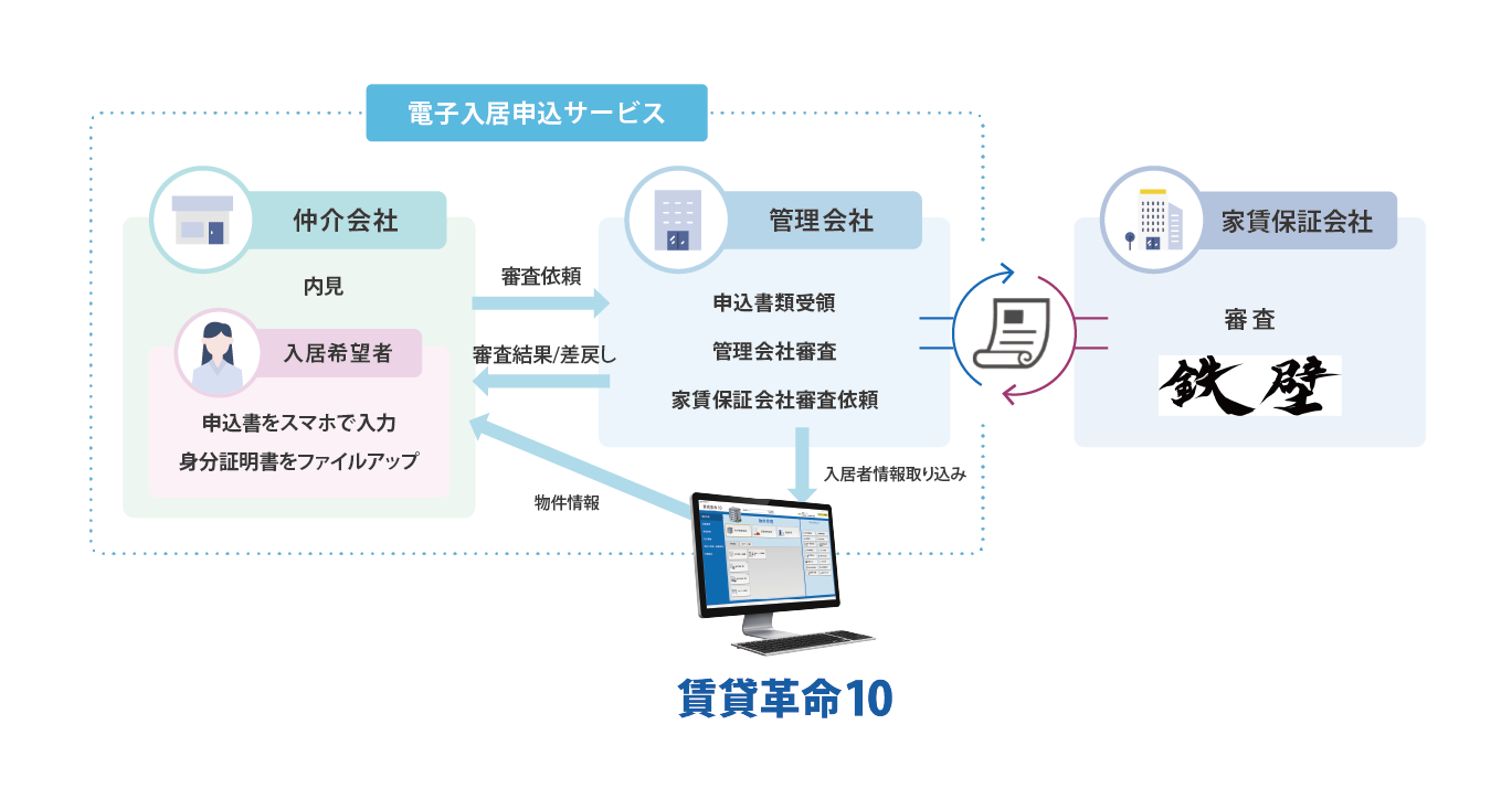電子入居申込サービスは、弊社が不動産会社に向けて提供する無料のサービスであり、導入することで入居申込のやり取りのほとんどをオンラインで完結させることができます。また、弊社が提供するクラウド型の賃貸物件総合管理システム「賃貸革命10」と一緒にご利用いただくことで、物件情報や入居者情報等の共通のデータが連携し、作業担当者はより広い範囲での業務効率化が実現します。