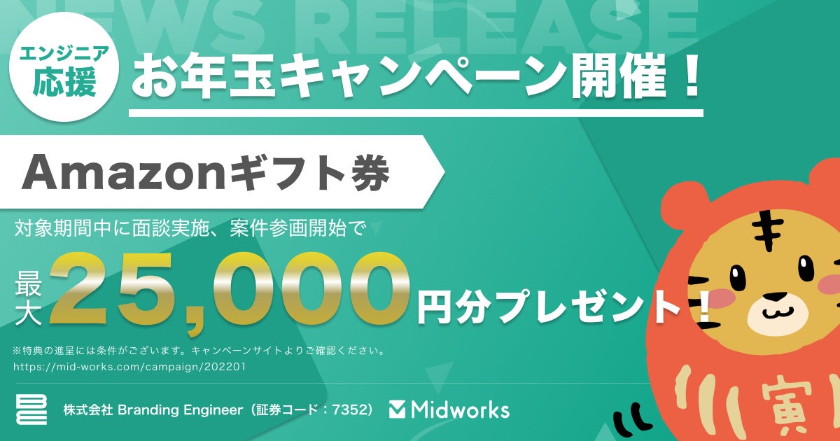Branding Engineer が提供するITエンジニア向けの独立支援サービス「Midworks」の登録ユーザー数20,000人突破を記念して、「エンジニアを応援!お年玉キャンペーン」を実施