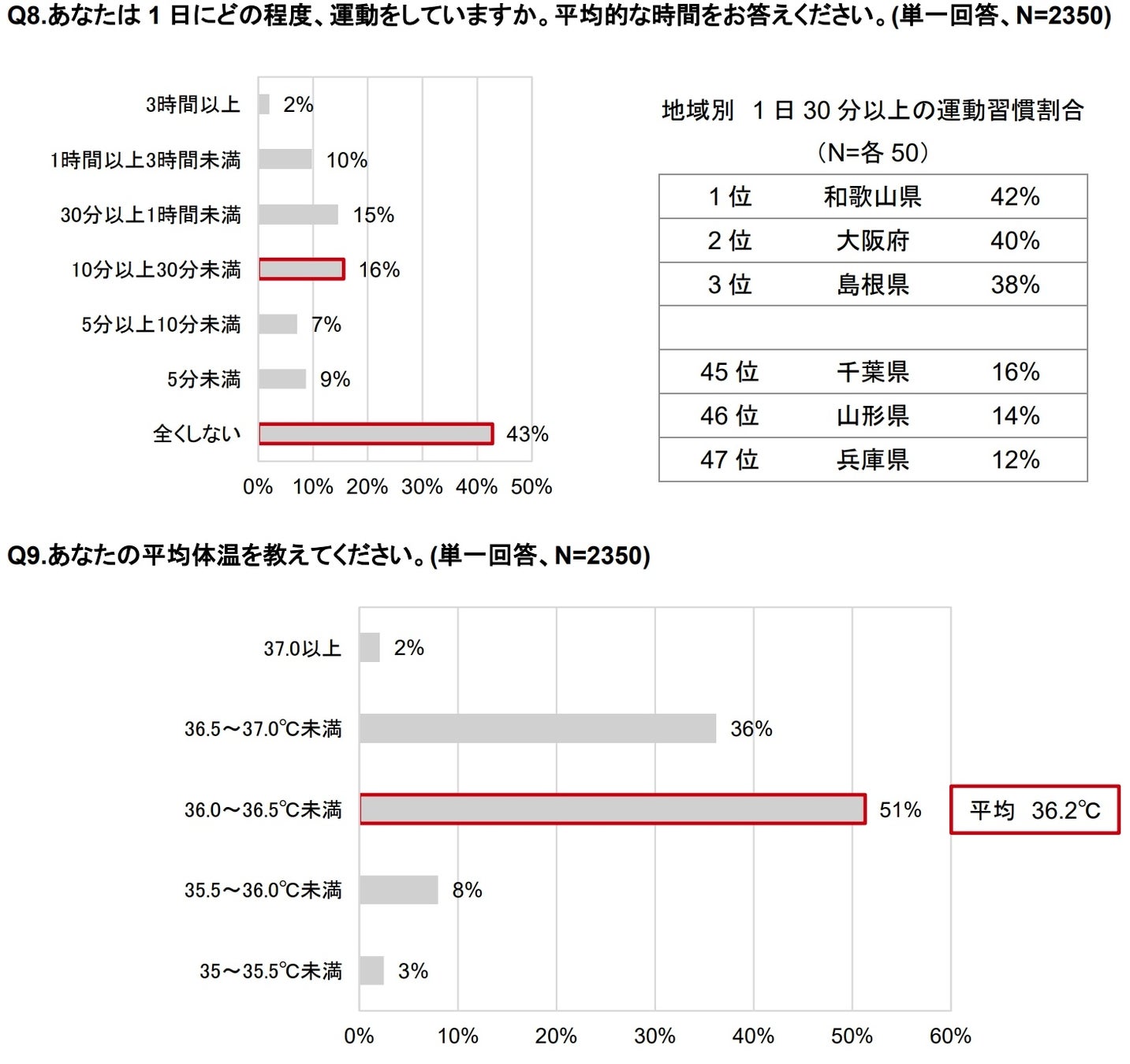 運動時間1日30分以上 1位和歌山県 平熱の低下は運動不足が原因?