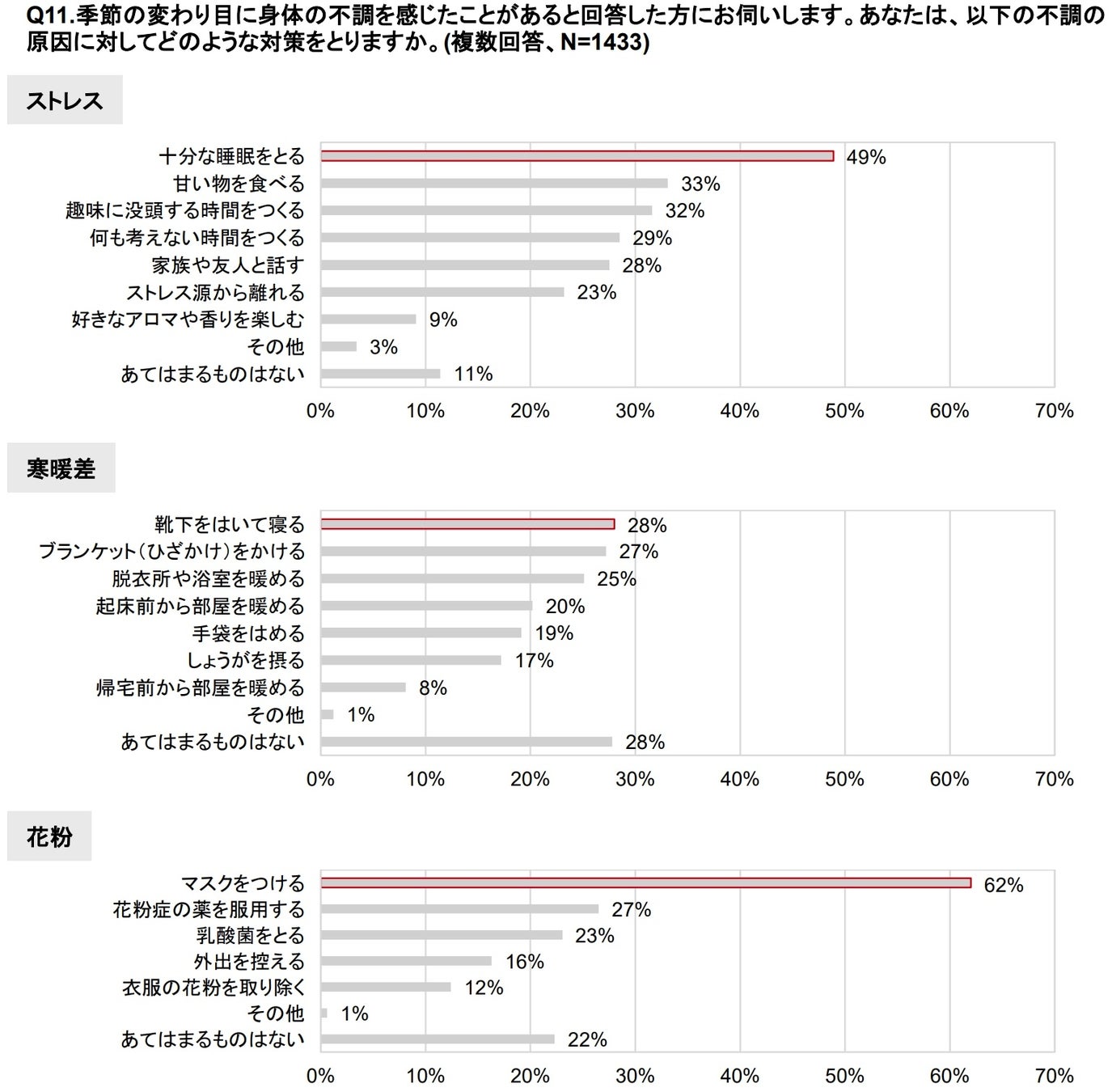 不調の原因となるストレス、寒暖差、花粉について、対策を聞きました。最も多い回答は、ストレスが「十分な睡眠をとる(49%)」、寒暖差が「靴下をはいて寝る(28%)」、花粉が「マスクをつける(62%)」でした。