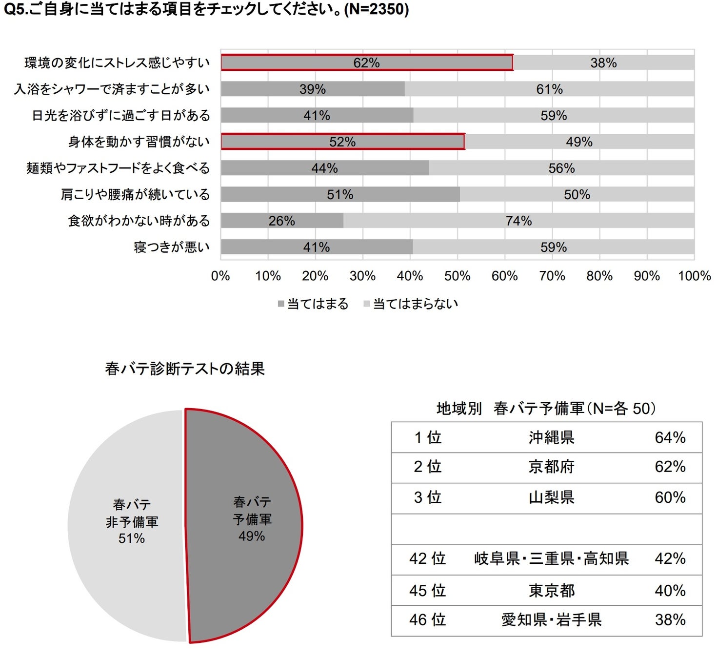 調査対象者へのテストの結果、4個以上あてはまる「春バテ予備軍」は、全体の49%でした。あてはまる割合が最も多い項目は「環境の変化にストレス感じやすい(62%)」、次いで「身体を動かす習慣がない(52%)」でした。地域別の春バテ予備軍は、最も多いのが沖縄(64%)、少ないのが岩手・愛知(38%)でした。