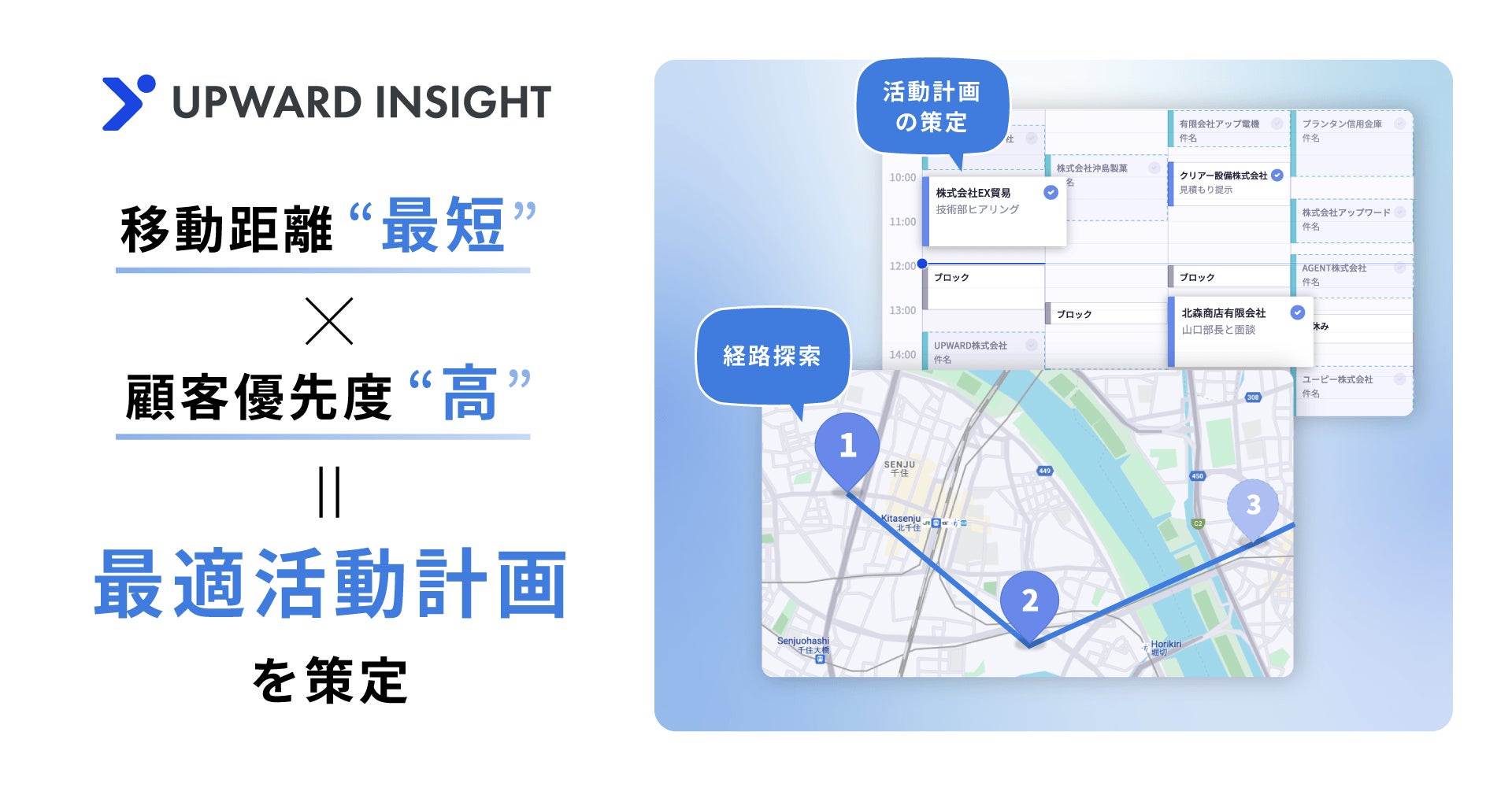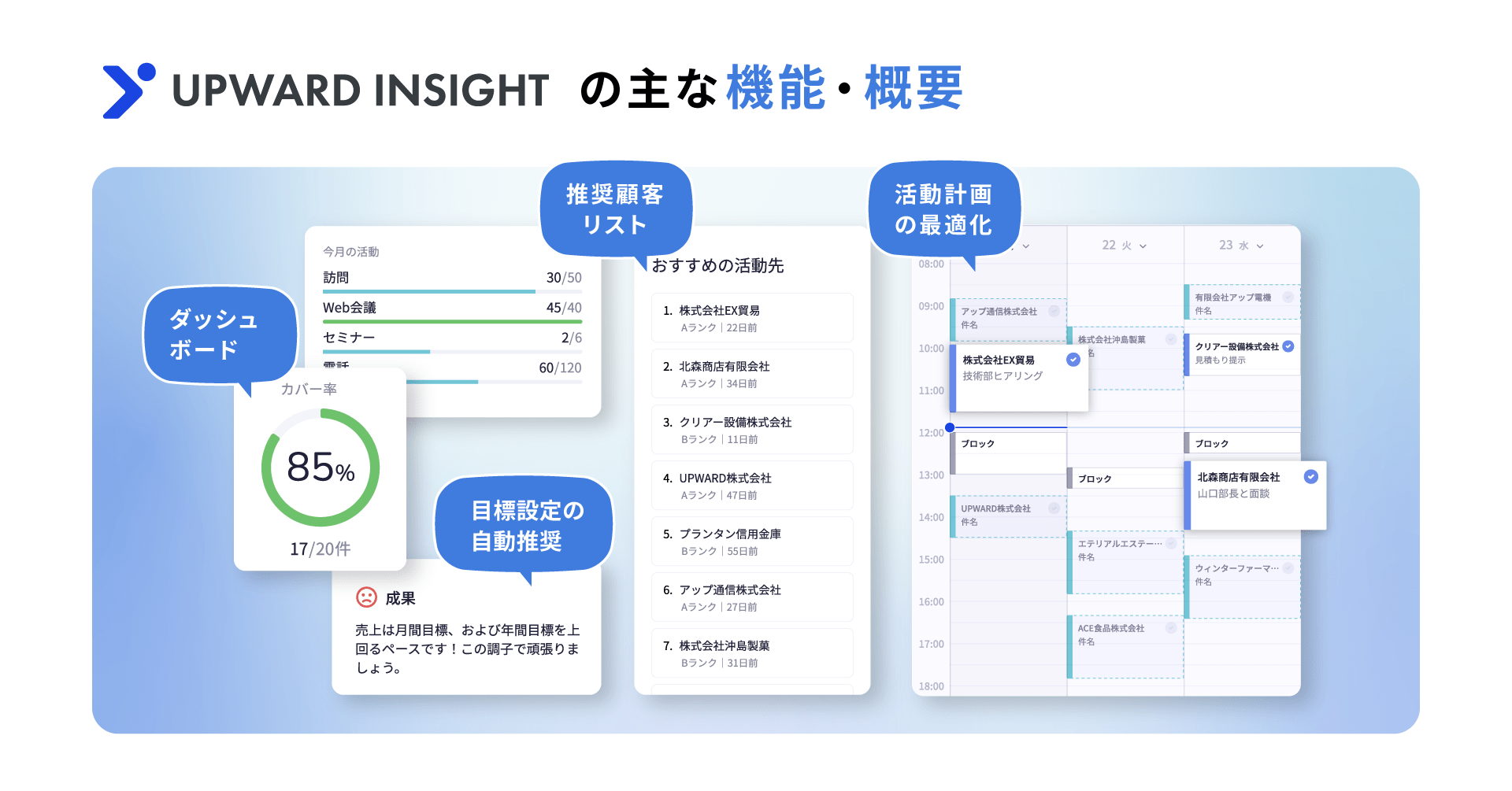 日々の活動状況の把握がわからない、戦略的にどの顧客に対して営業すれば良いかわからない、活動計画の策定に大きな稼働がかかっており無駄が多い、そのようなお困りごとがございましたら「UPWARD INSIGHT」がサポートします。今後も、「UPWARD INSIGHT」を利用することで、活動量に加えて議論や思考の時間が増加し質を高められるような機能拡張を推進していきます。