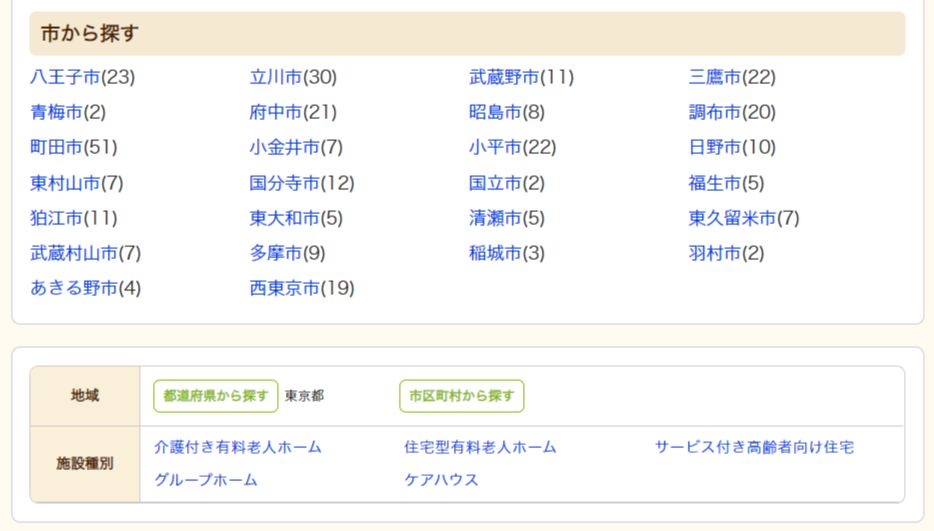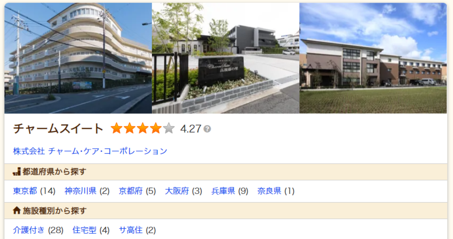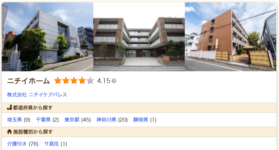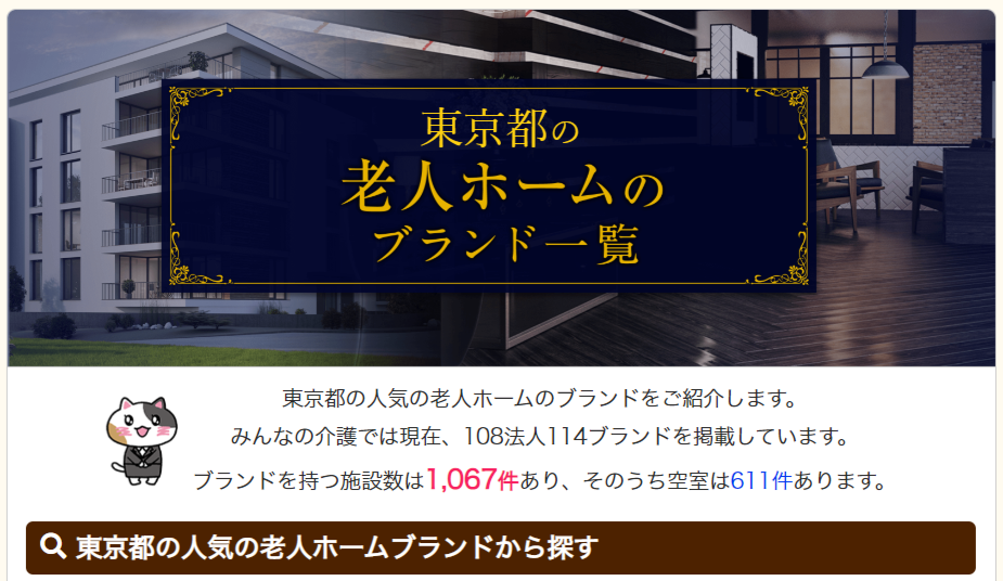 こちらのブランドは、東京都に多くの施設を展開しており、介護付き有料老人ホームに注力していることがわかります。