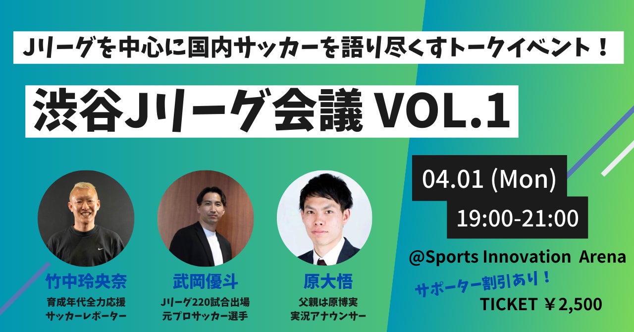 株式会社Link Sportsに併設するSports Innovation Arenaにて、JリーグファンによるJリーグファンのためのトークイベントの開催が決定いたしました。4月1日より定期的に実施予定です。スピーカーとして、㈱Link Sports執行役員でサッカーレポーターとしても活動する竹中玲央奈と、横浜FCや川崎フロンターレで活躍した元Jリーガーの武岡優斗さん、DAZNやスカパー!のサッカー中継で活躍中のアナウンサー・原大悟さんの3人が登壇。この3人がメインとなり、毎回ゲストを招聘して定期的にその週末のJリーグのレビューや業界の裏話などを発信いたします。