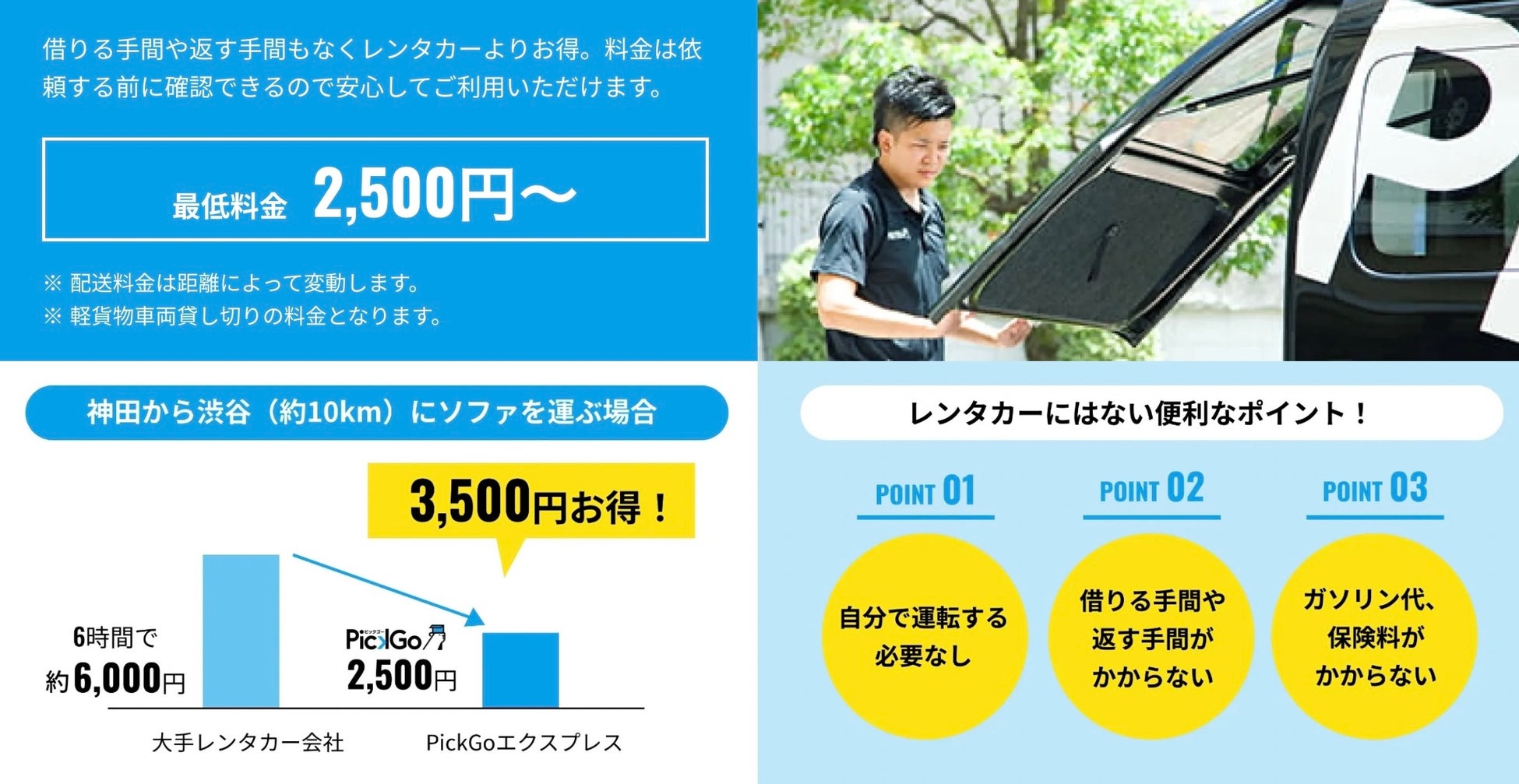 緊急/即日配送サービス「PickGoエクスプレス」は、ウェブやアプリから3ステップで依頼するだけで経験豊富な配送パートナーがあなたの荷物を好きな時間・好きな場所に集荷に伺い緊急配送致します。プライベートやお仕事で急いで届けたい時、「PickGoエクスプレス」があなたの代わりにすぐお届けします。レンタカーで運びたいけど運転が不安、タクシーに載せたいけど大きすぎるといった皆様の課題を解決します。