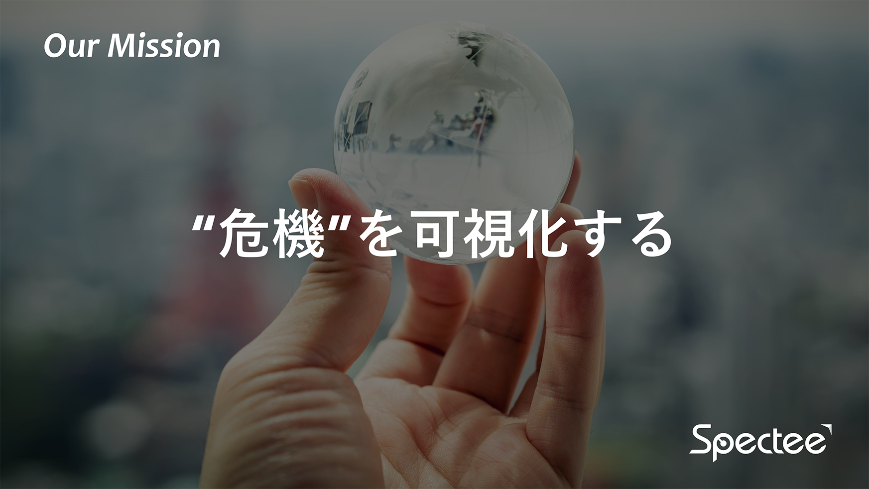 私たちスペクティは、こうした世界で起きるあらゆる「危機」に対して、最先端の技術力をもとに、これまで培ってきたデータ収集する力、それを解析しシミュレートする力を大いに発揮し、リスクを見える化すること、そしてその先に起きる被害を予測することで、「危機」に強い社会・持続可能な社会を創ることを目指しています。