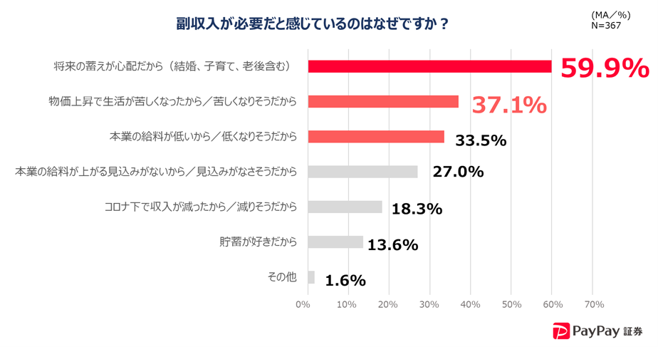 副収入が必要だと思っている人(367人)にその理由を聞いたところ、最も多かったのは「将来の備えが心配だから」で59.9%。次いで「物価上昇(37.1%)」、「本業の給料が低いから(33.5%)」、「本業の給料が上がる見込みがないから(27.0%)」の順。トップは将来への漠然とした不安だったが、2位以降は「物価上昇」や「給料が上がる見込みがない」など、直近の情勢不安などによる影響で、副収入の必要性が増していることが見受けられました。
