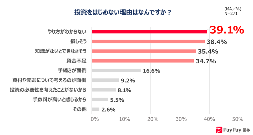 投資をしていない人(271名)に対して、はじめていない理由について聞いたところ、「やり方がわからない」が39.1%と最多でした。次いで、「損しそう(38.4%)」、「知識がないとできなさそう(35.4%)」「資金不足(34.7)」という結果。“損しそう”や“知識不足”のほか、“資金不足”といった金銭面の不安から投資をしていない人が多いことが分かりました。
