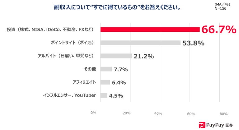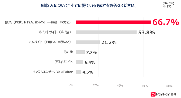 さらに、副収入を得ている人(156人)に対し、副収入として“すでに得ているもの”を聞いたところ、トップは「投資」と66.7%という結果。次いで、「ポイントサイト(53.8%)」、「アルバイト(21.2%)」と、副収入が注目されているが、実際に「インフルエンサー」「アフィリエイト」など、その他の方法で副収入を得ている事例は少ないことが分かりました。