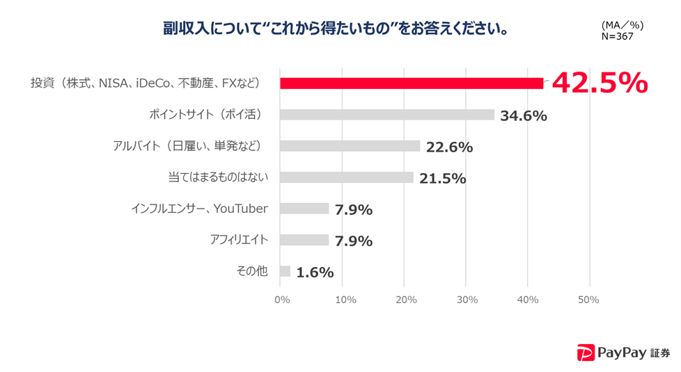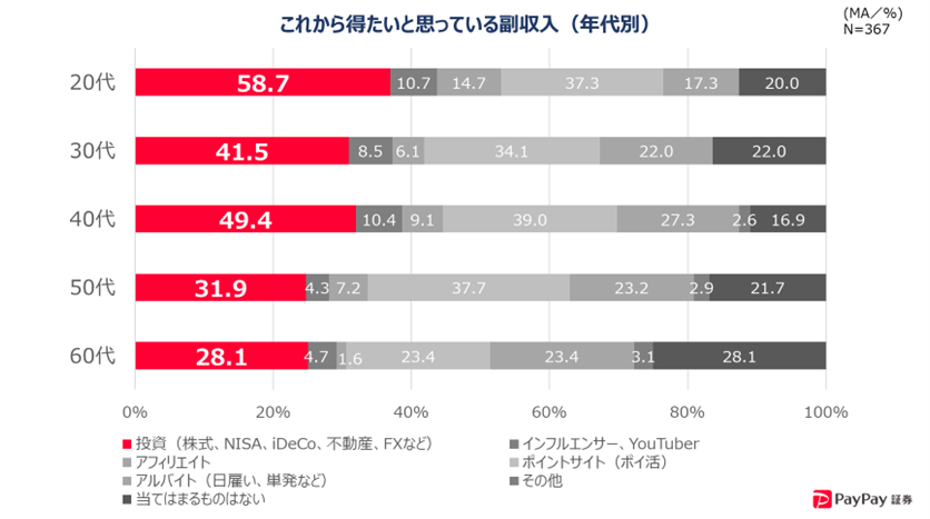副収入が必要だと思っている人(367人)に対して、副収入として“これから得たいもの”を聞いたところ、トップは「投資(42.5%)」。また、年代別でみると、20代は58.7%と、60代の21.8%に比べ36.9ポイント高いという結果に。若い世代の方が、年配の人よりも投資に対して意欲的であるということが分かりました。