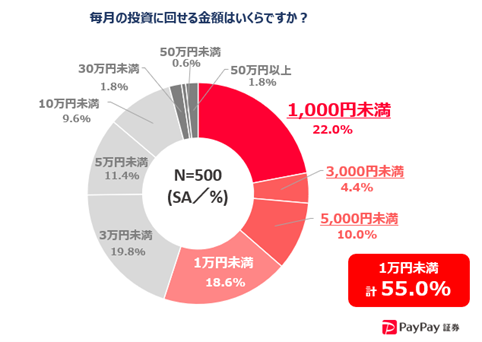 毎月の投資に回せる資金について聞くと、「1000円未満」が22.0%と最多。また、「1000円未満」~「1万円未満」で55.0%と、過半数が毎月の投資に回せる資金としては1万円未満と答えています。