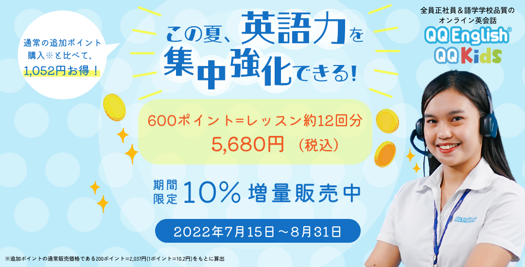 株式会社QQ English (本社:東京都新宿区、代表取締役:藤岡 頼光)は、提供するオンライン英会話サービス「QQ English」「QQキッズ」にて、追加ポイント「600ポイント(レッスン約12回分)=5,680円税込」の発売を記念して、10%増量キャンペーンを実施することをお知らせいたします。