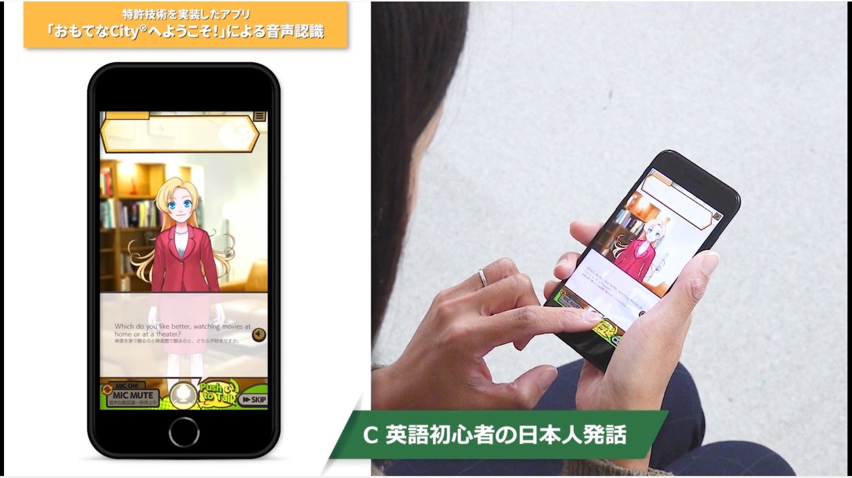 本件の音声認識技術を使用し、日本人特有の英語の発音を聞き分けて対話を組み立てられる人工知能(AI)を搭載した、画期的な対話型英会話アプリ(以下、本アプリ)です。英語初心者から上級者まで「まるでリアルシーンで会話しているかのような自然なコミュニケーション」をアプリ上で疑似体験することができます。