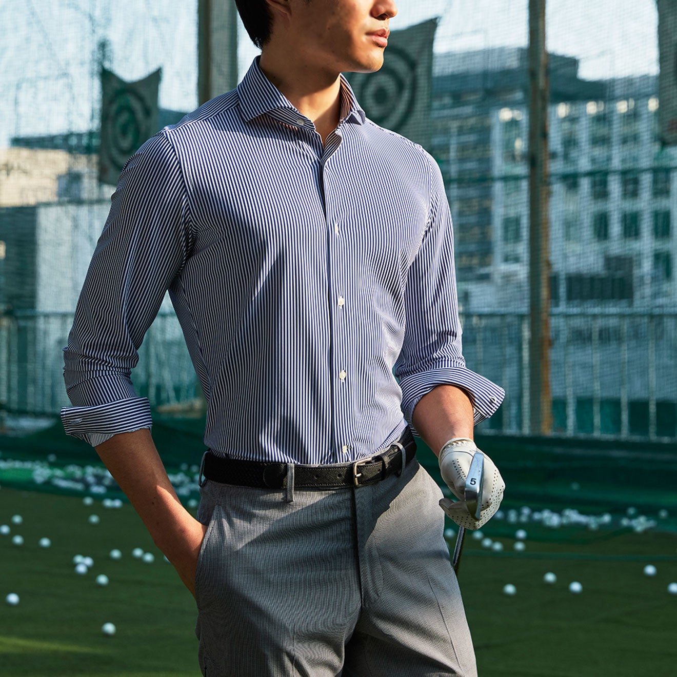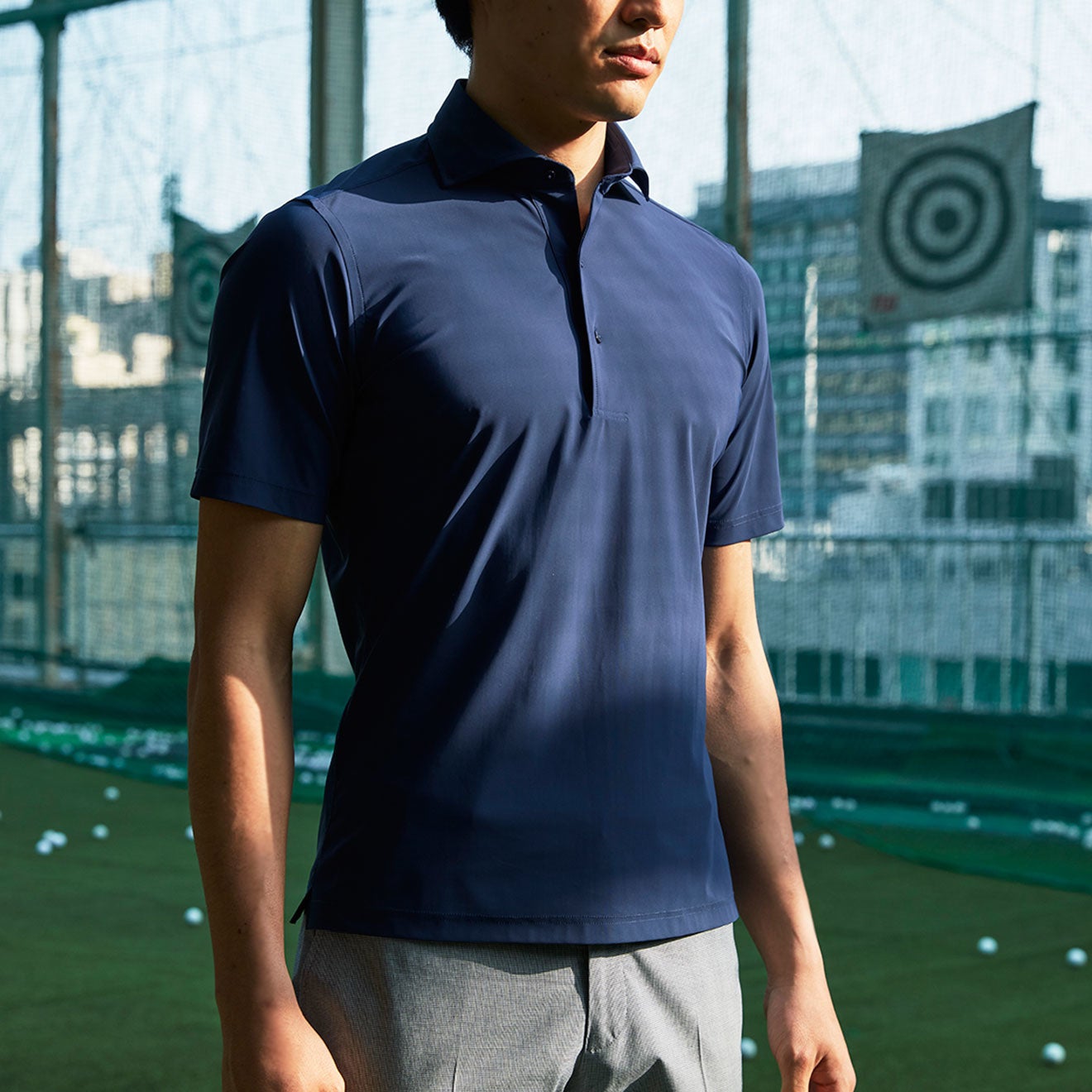 ドレス仕立てのシャツや半永久クリースを備えたパンツによって、紳士のスポーツらしいドレッシーな装いを表現。スポーツテイストを前面に押し出した装いとは一線を画します。それでいてどのウエアも高ストレッチを備えているため体の動きを邪魔せず、プレーに集中できます。