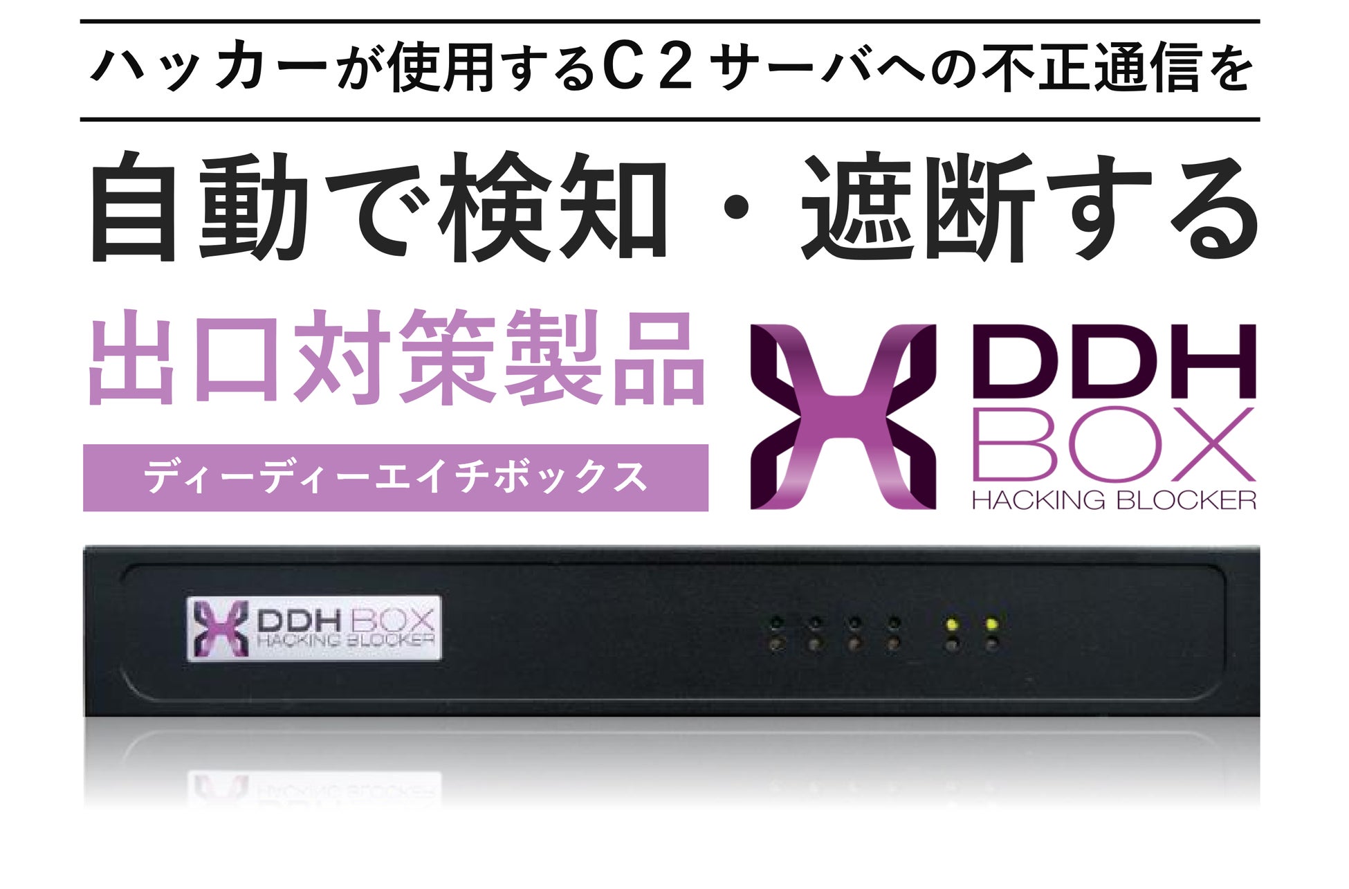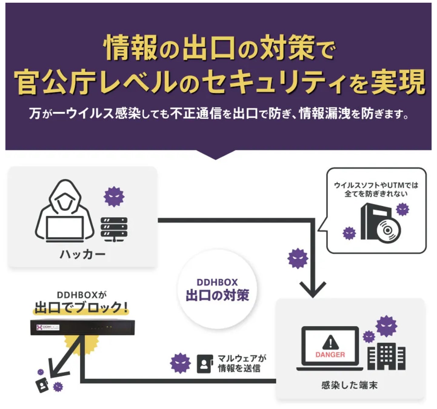 『DDHBOX』は、デジタルデータソリューションが提供するセキュリティ製品です。マルウェア(*1)による不正な通信を自動で検知・遮断し、情報漏洩を防ぎます。