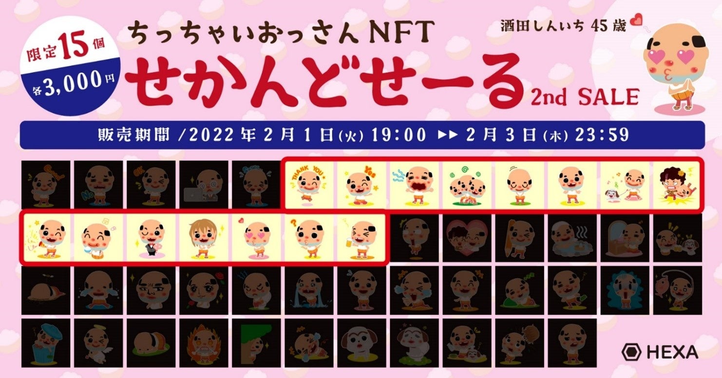 大好評につきセカンドセールでは、兵庫県尼崎市非公認ご当地キャラクター「ちっちゃいおっさん」のNFTデジタルアート15種類を2月1日(火)19:00よりHEXA(ヘキサ)にて販売いたします。