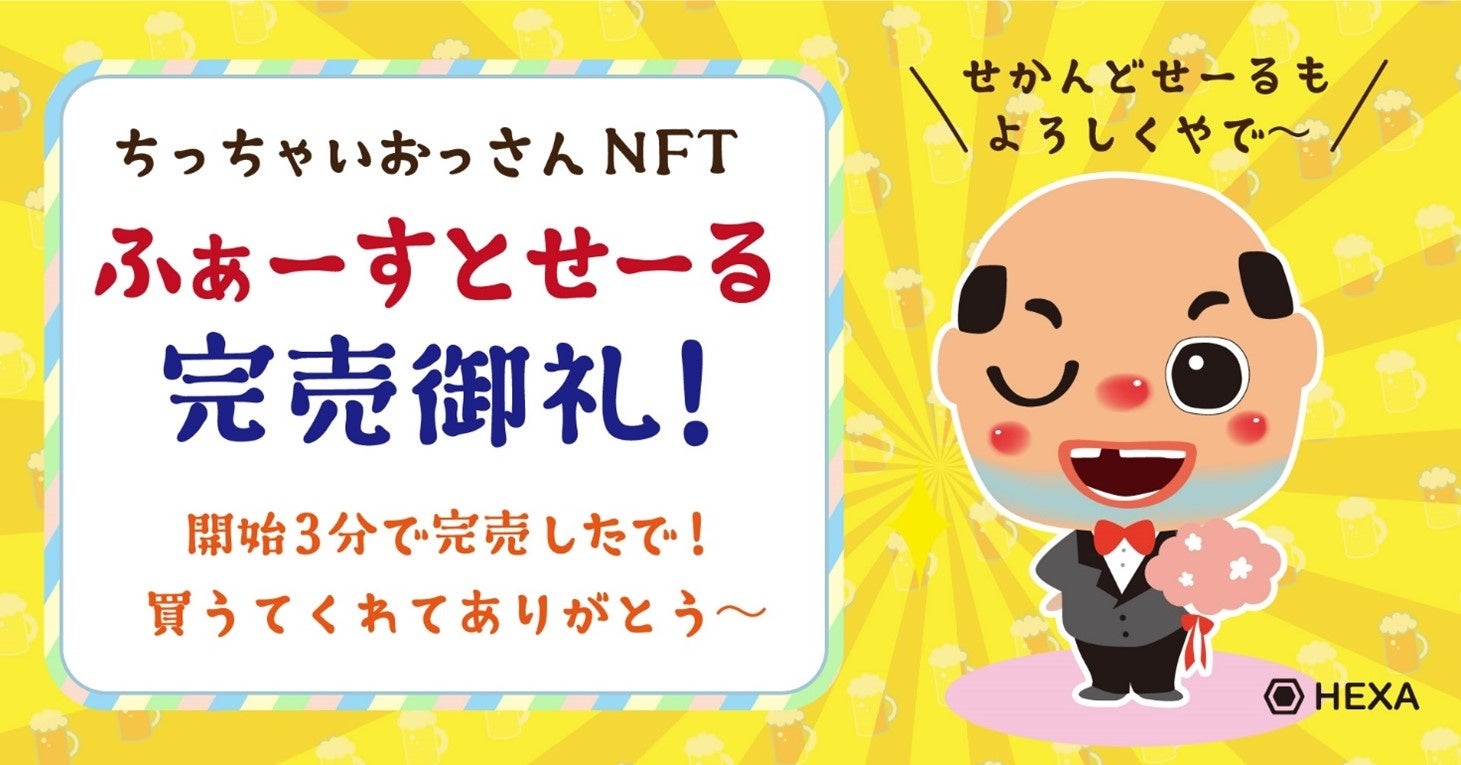ブロックチェーン機能を用いたオープンガバナンスによるトークンエコノミー(地域経済圏)の形成を目的に開催したファーストセール、兵庫県尼崎市非公認ご当地キャラクター「ちっちゃいおっさん」NFTデジタルアートがわずか3分で完売しました。