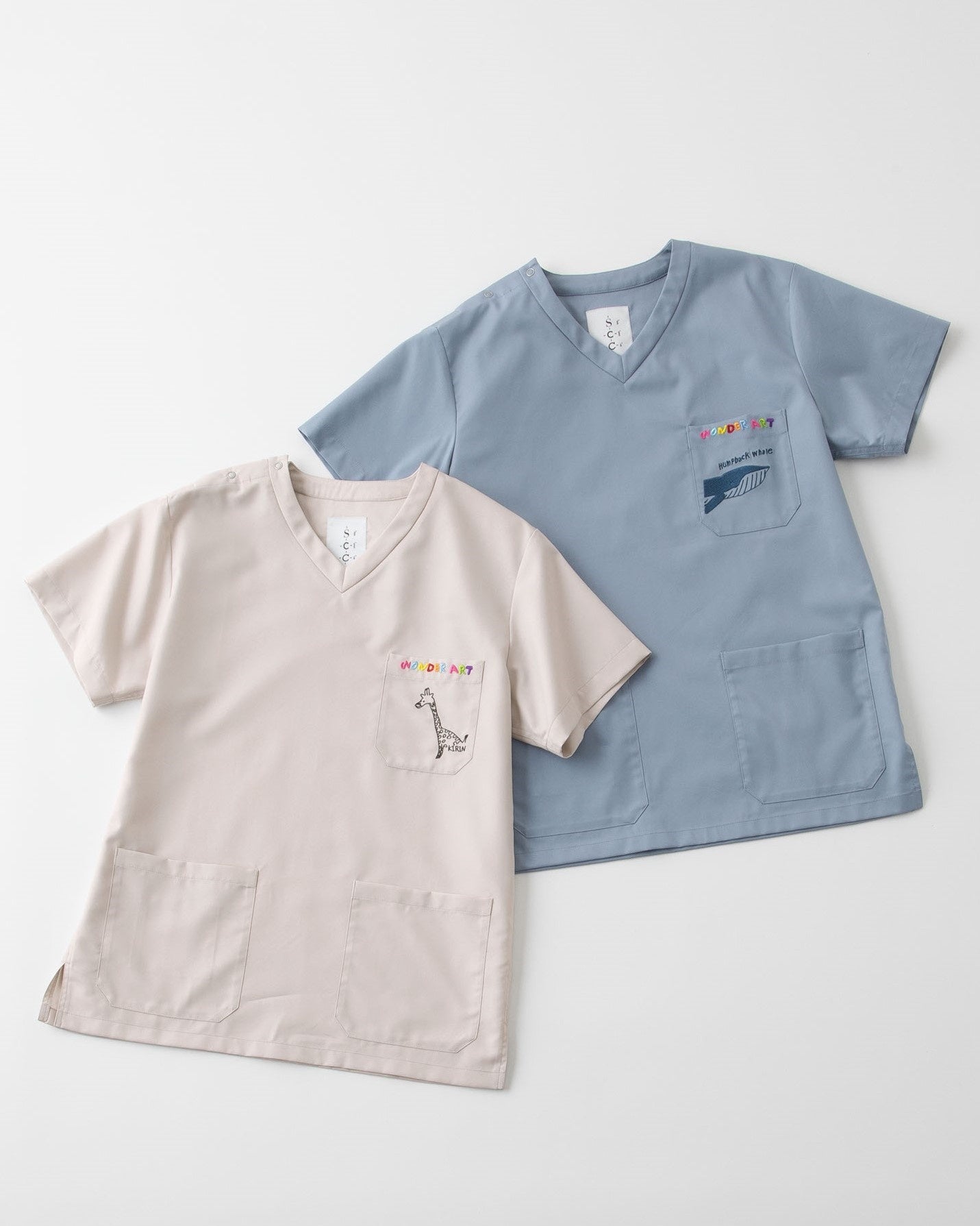 長きに渡ってホスピタルアートに携わり、アートによる医療環境の改革を目指してきたNPO法人ワンダーアートとのコラボレーションスクラブ。アートスタジオに通う子どもたちが描きあげた作品をスクラブにのせて、医療現場に元気を与えるようなアートを運びます。