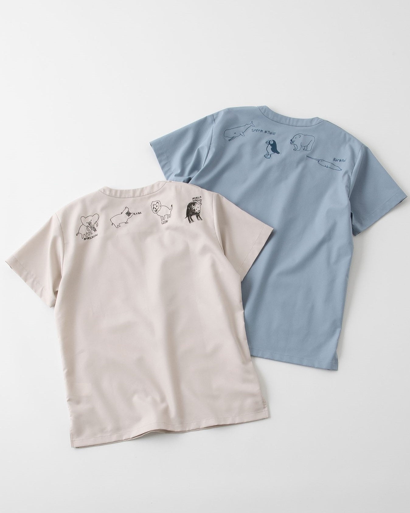 陸と海の様々な動物がスクラブの中を自由に動き回っているデザインです。