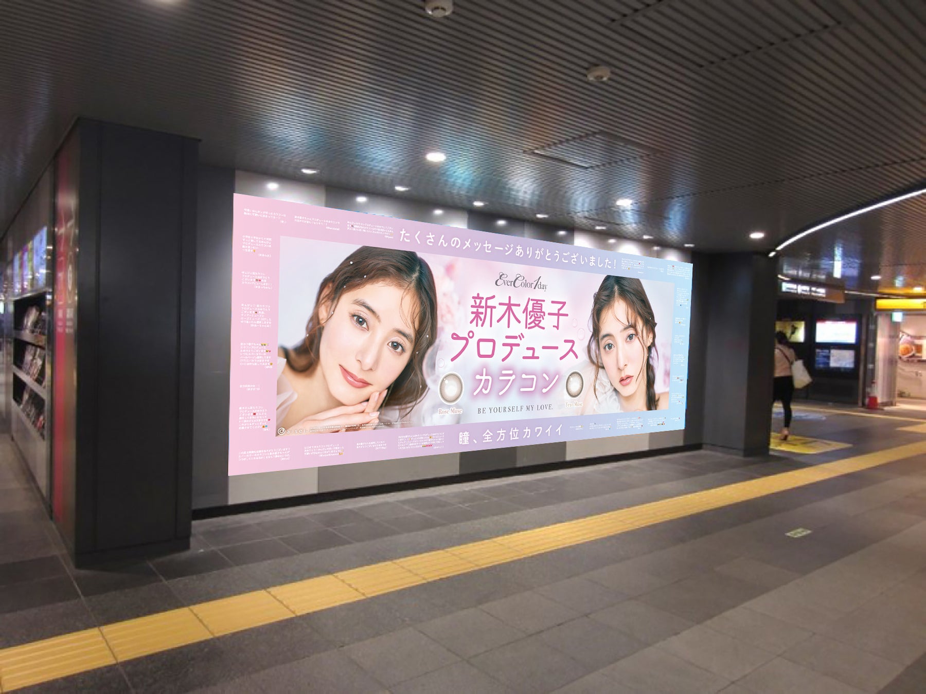 新木優子さん初カラコンプロデュース発売記念!ファンからの愛があふれるメッセ―ジが渋谷駅にて掲載中!
