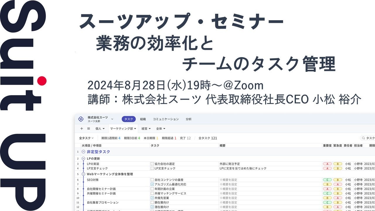 株式会社スーツ(所在地:東京都千代田区、代表取締役社長CEO:小松 裕介)は、2024年8月28日(水)19時から、当社代表の小松が講師を務めるスーツアップ・セミナー「業務の効率化とチームのタスク管理」を無料開催します。