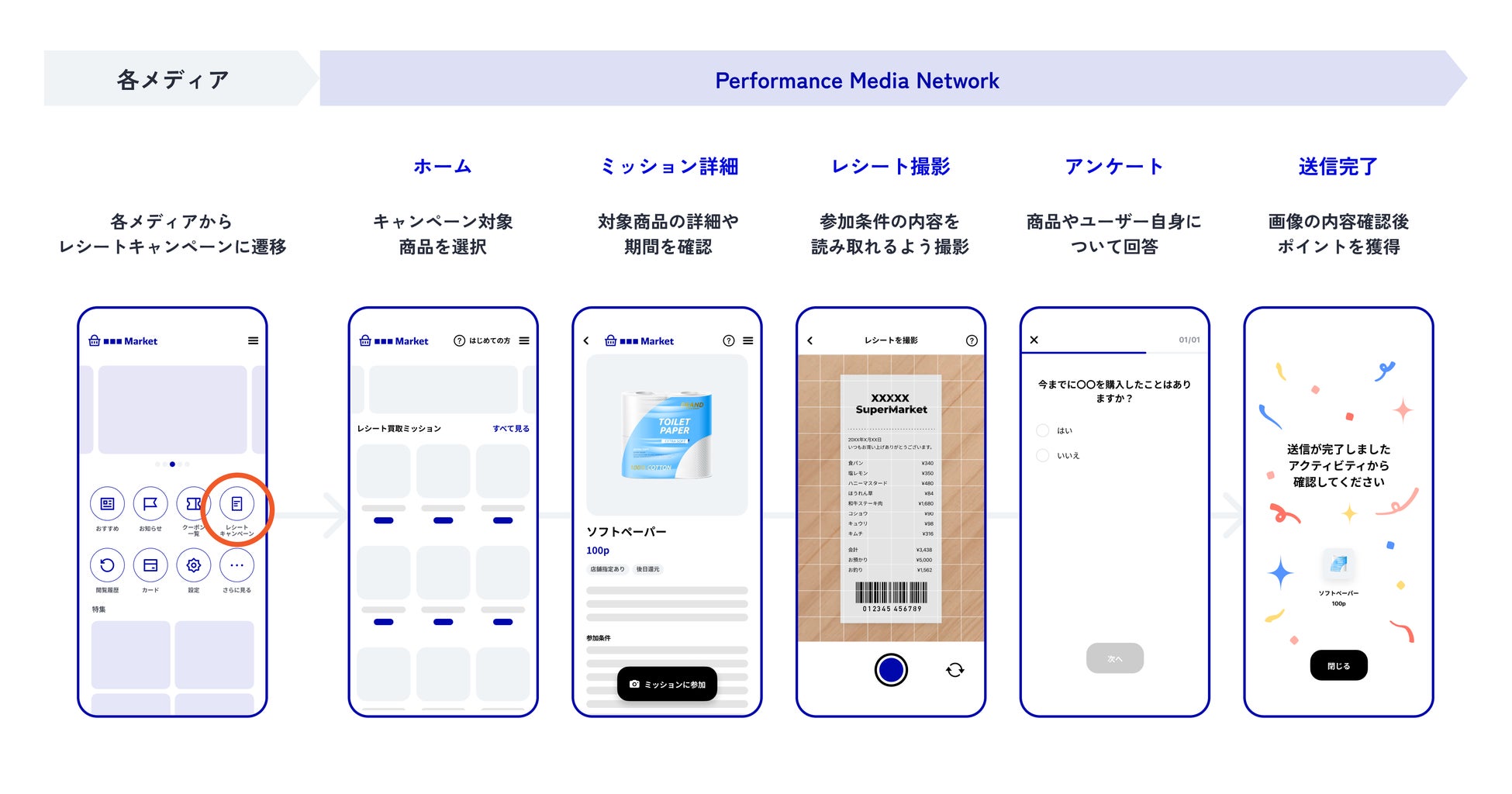 メディアパートナーである各生活者向けアプリのユーザーは、アプリの誘導バナーから詳細情報を取得します。 施策の対象商品を対象店舗で購入後、アプリの誘導バナーからキャンペーンLPに遷移し、レシートをアップロードすることでキャンペーンに参加が可能です。レシートをアップロードし、AI解析による購買判定後に、インセンティブとして、メディアパートナーであるアプリの専用ポイントや「えらべるPay®」を獲得することができます。