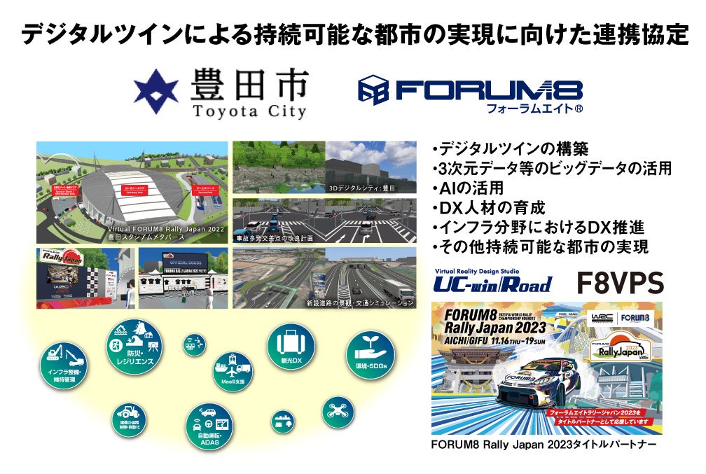 株式会社フォーラムエイト(本社:東京都港区港南2-15-1、社長:伊藤裕二、URL:https://www.forum8.co.jp)は、豊田市と相互に連携し、市が抱える様々な課題について、デジタルツイン上でのシミュレーション等を活用し解決を図るため、「デジタルツインによる持続可能な都市の実現に向けた連携協定」を締結。2023年3月15日(水)に豊田市役所南庁舎5Fにて協定締結式を開催いたします。