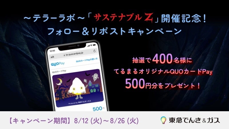 期間中、東急でんき&ガスキャラクター てるまるの公式Xアカウント(@terumaru_lemon)をフォローし、対象のキャンペーン投稿をリポストしていただいた方の中から、抽選で400名様にキャンペーン限定おばけてるまるオリジナルQUOカードPay500円分をプレゼントいたします。