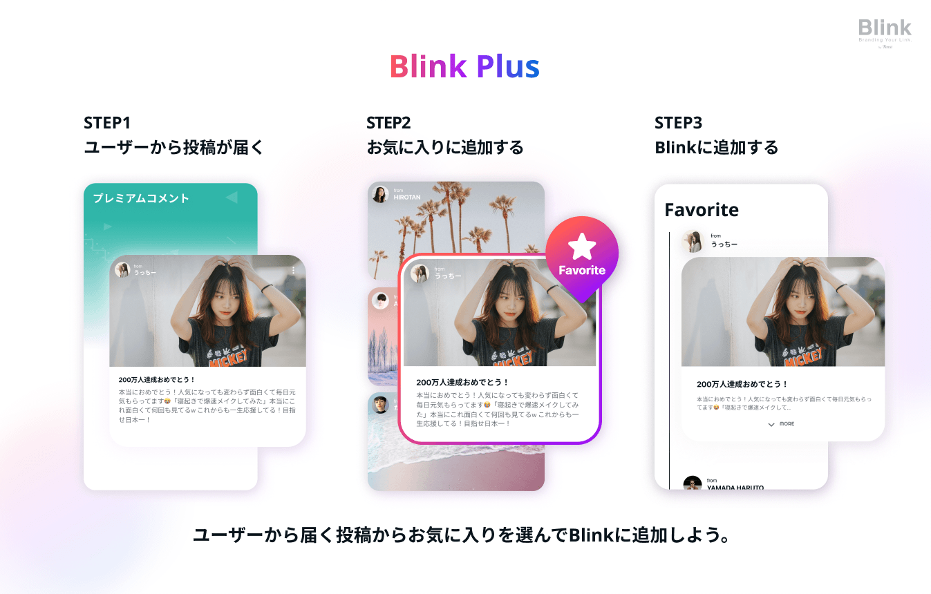 また、様々なリンクをまとめられるだけではなく、リンク作成者へメッセージや画像などを送ることができる機能「Blink Plus」によって、リンク作成者とユーザー間でアクティブなコミュニケーションを楽しんでいただけます。リンク作成者は投稿されたメッセージや画像を管理することができ、気に入った投稿のみ「Blink」のページに表示することが可能となっています。