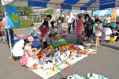 家で遊ばなくなったおもちゃを引き取ってカエルポイントを発行。そのポイントで会場のおもちゃと取りかえることができます。