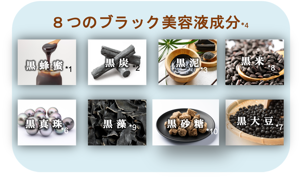 角栓を吸着する、黒炭*2・黒泥*3や、角質オフ後のお肌をキュッと引き締めハリを与える黒真珠*6や黒大豆エキス*7。黒蜂蜜*1などの保湿成分でお肌を潤し見た目も肌触りもツルツルになるよう厳選した成分を配合。