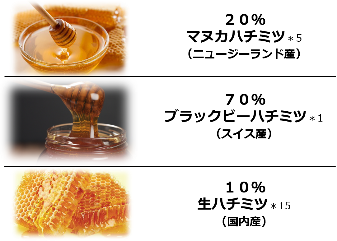 世界各地から厳選した3種のハチミツ*5を独自の比率※4で配合。ブラックビーハチミツ*1を採用することで、更なる美容効果を高めます。