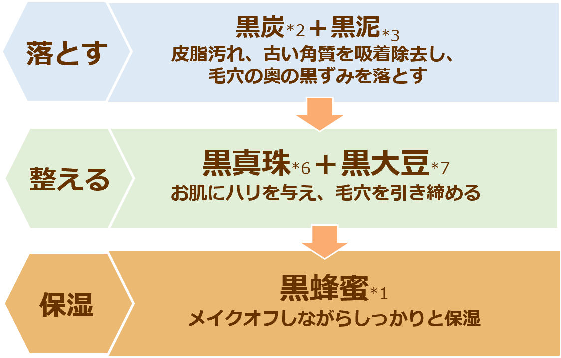*1 ハチミツエキス(保湿) *2 炭(吸着) *3 海シルト(吸着) *4 ハチミツエキス(保湿)、炭(吸着)、海シルト(吸着)、コメエキス(保湿)、加水分解ダイズエキス(保湿)、黒砂糖(保湿)、加水分解コンキオリン(保湿)、アスコフィルムノドスム/ヒバマタ/ヒジキ/トロロコンブ/レソニアニグレスセンス/ミツイシコンブ/リシリコンブ/ワカメエキス(保湿) *5 保湿 *6 加水分解コンキオリン(保湿) *7 加水分解ダイズエキス(保湿) *8 コメエキス(保湿) *9 アスコフィルムノドスム/ヒバマタ/ヒジキ/トロロコンブ/レソニアニグレスセンス/ミツイシコンブ/リシリコンブ/ワカメエキス(保湿) *10 黒砂糖(保湿) *11 オレンジ果汁、レモン果汁、グレープフルーツ果実エキス、リンゴ果実エキス、ライム果汁、ナツメ果実エキス、サンザシエキス(全て角質ケア) *12 加水分解ヒアルロン酸(保湿) *13 トコフェノール、パンテノール、パルミチン酸レチノール、テトラヘキシルデカン酸アスコルビル(全て整肌) *14 アルガニアスピノサ核油(保湿) *15 加熱処理しないハチミツ(保湿) *16 ライム果汁(香気・保湿)