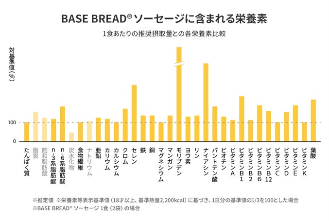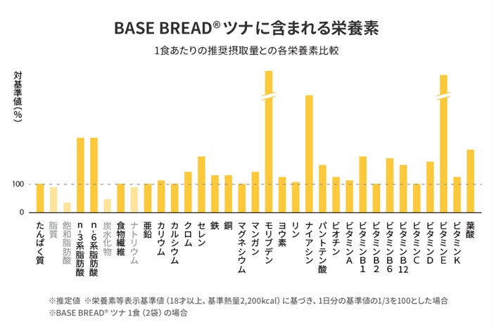 *1 主食(パン類、パスタ、クッキー)において、1食(BASE BREADは2袋、BASE PASTAは1袋、BASE Cookiesは4袋、BASE FOOD Deliは1袋)あたり2を満たし、栄養成分表示に表記している商品(2022年5月Mintel社データベースを使用した当社調べ)
