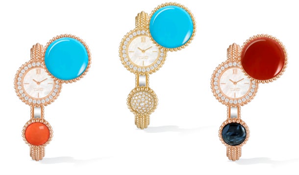 1つ目のモデルでは、カーネリアンの温かみのあるレッドとブラックピーターサイトが魅惑的なコントラストを成し、2つ目では、ターコイズの鮮やかなブルーがダイヤモンドとイエローゴールドの輝きをさらに引き立てます。また、数量限定となる3つ目のモデルでは、ターコイズとコーラルの生き生きとした色調が、光り輝くハーモニーを奏でます。周囲を縁取るゴールドビーズが、それぞれのカボションの丸みを帯びたシルエットを際立たせるとともに、カラフルな作品の最後の仕上げとして強い煌めきを放ちます。