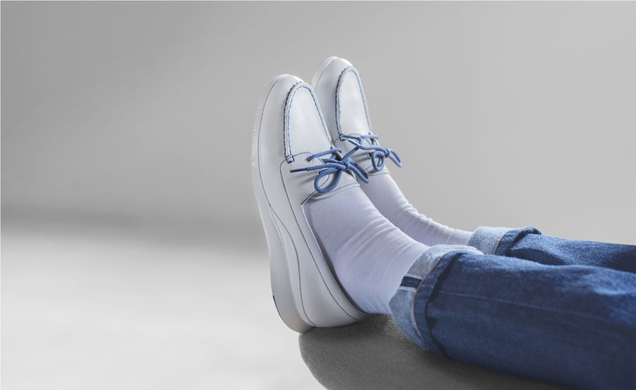 軽快な白の2アイレットモカを履き心地よく仕上げた軽量シューズは、春夏のお出かけにぴったりの1足。