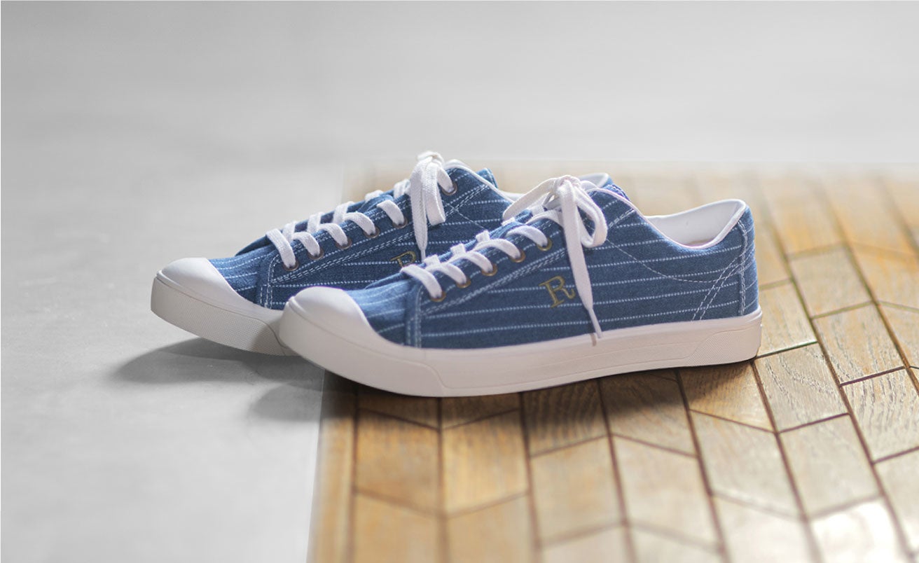 抜染(色を抜く)処理を施したオリジナルデニムのアッパーは、履くほどに味わいが変化する。